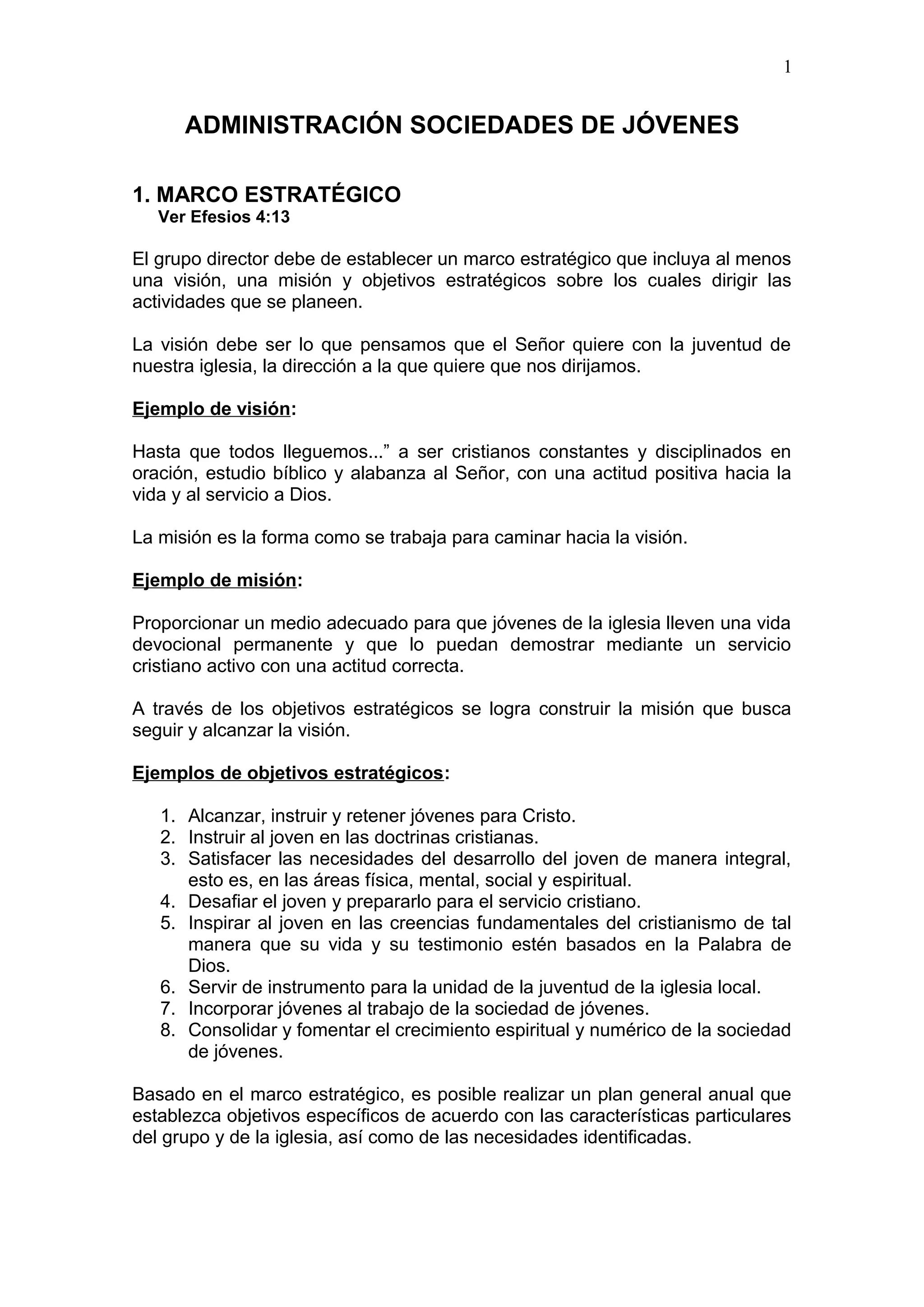 Este documento ofrece pautas para la administración de sociedades de jóvenes, incluyendo establecer un marco estratégico con visión, misión y objetivos. También discute clasificar los grupos de jóvenes por parámetros como tamaño y edad, y organizar un equipo de trabajo con roles específicos. Finalmente, enfatiza la importancia de planificar actividades alineadas con la visión y objetivos a través de un plan anual.