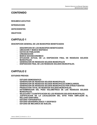 1. Este documento presenta el proyecto ejecutivo para el relleno sanitario metropolitano Poniente "Picachos" en la zona metropolitana de Guadalajara.