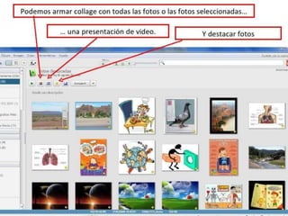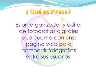 Picasa es un organizador y editor de fotografías digitales creado en 2002 por Lifescape y propiedad de Google desde 2004. Permite editar, compartir y almacenar fotos de forma gratuita a través de aplicaciones para Windows, Mac, Android y dispositivos móviles. Ofrece funciones básicas como recortar, corregir ojos rojos y agregar efectos, así como almacenamiento limitado en la web y compatibilidad con redes sociales como Blogger, Buzz y Facebook.