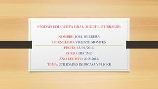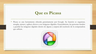 Este documento describe las utilidades de Picasa y Flickr. Picasa es una herramienta de Google para organizar, editar y compartir imágenes digitales, mientras que Flickr es un sitio web para almacenar, ordenar, buscar y compartir fotos y videos. Ambos permiten cargar imágenes ilimitadas, organizar álbumes, y compartir contenido en línea.