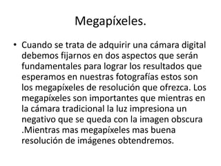 Picaza es una herramienta web para visualizar, organizar y editar fotografías digitales que también tiene un sitio web integrado para compartir fotos y permite inventariar todos los archivos gráficos del ordenador. Al comprar una cámara digital, los megapíxeles y la resolución son importantes para obtener buena calidad de imágenes. Para tomar buenas fotos, se recomienda mantener la cámara fija, experimentar con la luz, usar fondos adecuados y buscar la máxima resolución. Fotolog es