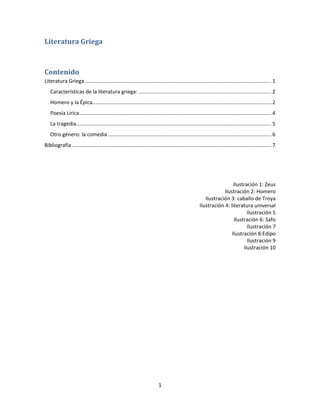 La literatura griega incluye obras épicas atribuidas a Homero como la Ilíada y la Odisea, poemas líricos de autores como Safo y Alceo, y tragedias de Esquilo, Sófocles y Eurípides. Los mitos jugaron un papel central en estos géneros literarios que exploraban temas humanos universales como el destino y los dioses. La comedia también floreció como género que parodiaba a los héroes míticos.