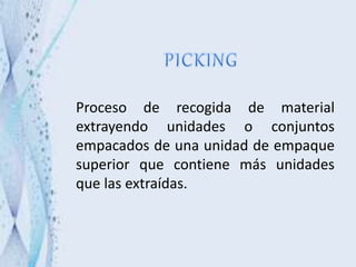 Este documento describe varios procesos y métodos para mejorar la eficiencia en la recogida y empacado de materiales, incluyendo optimizar las rutas de recogida, agrupar pedidos, extraer materiales de pedidos agrupados de una vez y separarlos después, y extraer materiales directamente a las cajas de envío. También menciona diferentes maquinarias y sistemas que pueden automatizar estos procesos.