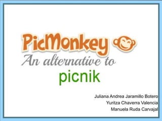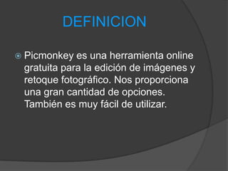 Picmonkey es una herramienta gratuita en línea para editar imágenes que proporciona varias opciones de edición agrupadas en secciones como ediciones básicas, efectos, retoque, texto, capas y bordes. Los usuarios pueden cargar una foto, aplicar múltiples efectos y ediciones, y guardar la foto editada. Picmonkey ofrece una interfaz sencilla y herramientas para recortar, cambiar la exposición, agregar filtros, eliminar imperfecciones, agregar texto e imágenes, y aplicar