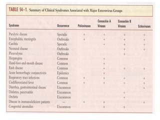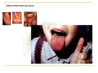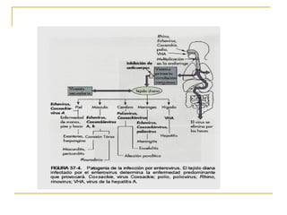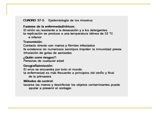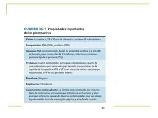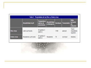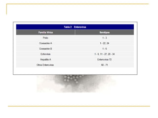 Este documento proporciona información sobre la familia Picornaviridae. Incluye 6 géneros principales de virus como Enterovirus, Rinovirus y Aftovirus. Los Picornavirus son pequeños, desnudos, con ARN y capside icosaédrica. Causan enfermedades como el resfriado común, la poliomielitis y la fiebre aftosa. Se transmiten fácilmente de persona a persona a través de secreciones respiratorias, heces u otros fluidos contaminados.