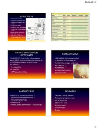Este documento resume las características de los picornavirus, una familia de virus pequeños que incluye enterovirus, rinovirus, hepatovirus y otros. Los picornavirus pueden causar una variedad de enfermedades desde parálisis graves hasta resfriados comunes. Tienen una estructura icosaédrica formada por una cápside proteica que protege su genoma de ARN monocatenario. Se replican en el citoplasma celular y se liberan a través de la lisis de la célula huésped. Su diagnóstico incluye