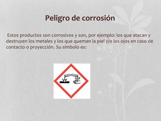 El documento describe tres tipos de pictogramas de peligro: corrosión, explosión y comburentes. El pictograma de corrosión se usa para productos corrosivos que atacan metales y queman la piel u ojos. El pictograma de explosión indica que un producto puede explotar al entrar en contacto con llamas, chispas o calor. Y el pictograma de comburentes señala sustancias que reaccionan fuertemente con inflamables desprendiendo gran energía.