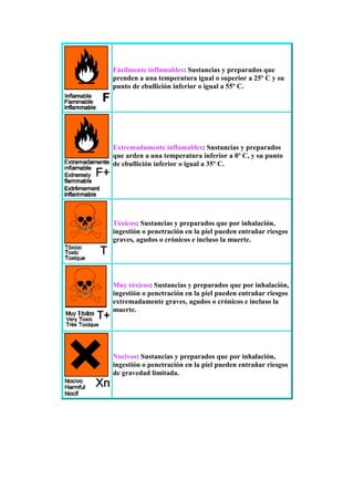 Este documento describe los pictogramas utilizados en el etiquetado de productos químicos para indicar los riesgos asociados a su manipulación. Explica que existen 10 marcas de peligrosidad asignadas a pictogramas fijos que representan sustancias explosivas, comburentes, corrosivas, fácilmente inflamables, extremadamente inflamables, tóxicas, muy tóxicas, nocivas, irritantes y nocivas para el medio ambiente. Cada pictograma se asocia a un significado de peligrosidad específico relacion