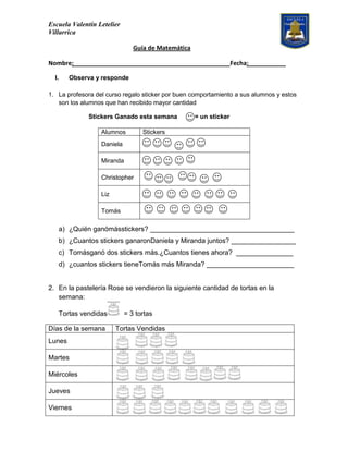 Este documento presenta tres ejercicios de matemáticas con preguntas sobre stickers entregados a estudiantes, tortas vendidas en una pastelería durante la semana y libros prestados en una biblioteca escolar. En el primer ejercicio se pide identificar quién ganó más stickers y cuántos ganaron dos estudiantes juntos. En el segundo, se identifica el día con más ventas de tortas y la cantidad vendida. En el tercero, se pide el total de libros prestados en la semana y la cantidad en días específicos.