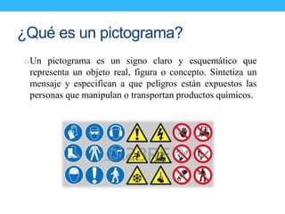 Un pictograma es un signo que representa de forma clara y esquemática un objeto, figura o concepto. Los pictogramas de peligro sintetizan mensajes que advierten sobre los riesgos asociados con sustancias químicas como la explosión, inflamabilidad, toxicidad, corrosión, gases bajo presión y otros peligros para la salud o medio ambiente.