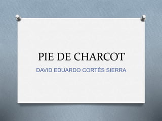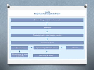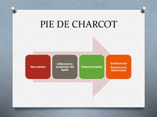 El documento describe el pie de Charcot, una neuropatía que causa inflamación e inestabilidad ósea en el pie, lo que lleva a fracturas, deformidades y artropatía. Explica la fisiopatología, que involucra daño óseo continuado debido a la inflamación y la falta de sensibilidad. También cubre los síntomas, diagnóstico, y tratamiento, que incluye aliviar la sobrecarga en el pie, tratar la enfermedad ósea subyacente, y cirugía para corregir deformidades