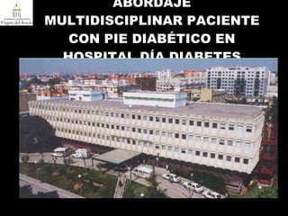 Este documento describe el abordaje multidisciplinar de pacientes con pie diabético en un hospital de día de diabetes. Explica que el hospital de día ofrece tratamiento para varias condiciones relacionadas con la diabetes como pie diabético avanzado. Los pacientes son evaluados por especialistas en endocrinología, cirugía vascular, enfermería y podología. La mayoría de pacientes con úlceras grado 2 y 3 pudieron ser tratados de forma ambulatoria, aunque un 29,55% requirió ingreso. El enfoque multidisciplinar perm