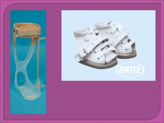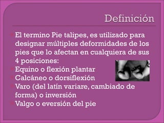 El documento habla sobre el pie talipes, una deformidad congénita del pie que incluye equino, varo y otras posiciones anormales. El tipo más común es el pie de Boot, que combina equino y varo. Se presenta en 1 de cada 1000 nacimientos y es más frecuente en niños que niñas. Su tratamiento incluye corrección gradual de la deformidad con yesos y mantenimiento con calzado especial para prevenir recidivas.