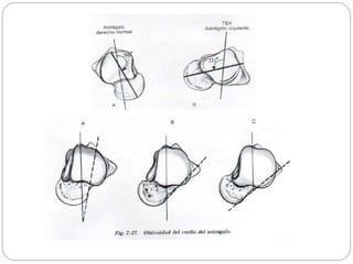 El documento describe el pie equinovaro congénito, incluyendo su definición, incidencia, herencia, causas, cuadro clínico, deformidades óseas, clasificaciones y tratamiento. El tratamiento más efectivo es el Método Ponseti, el cual involucra manipulaciones semanales y enyesado para corregir el cavo, aducto y varo, seguido de una tenotomía del tendón de Aquiles y uso prolongado de férulas de abducción.