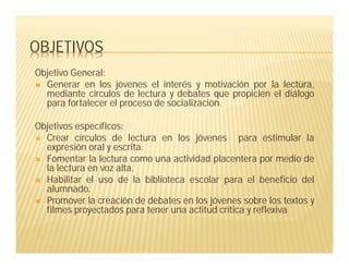 Este documento presenta un proyecto de intervención socioeducativa cuyo objetivo es fomentar la lectura en jóvenes de telesecundaria a través de círculos de lectura y debates. Describe el diagnóstico realizado, los objetivos del proyecto que incluyen generar interés en la lectura y fortalecer el proceso de socialización. También presenta las estrategias y actividades a realizar en cada etapa como presentación del proyecto, acercamiento a la lectura, trabajo en la lectura y cierre del proyecto. El