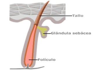 La piel es nuestro órgano más grande y está compuesta de tres capas: la epidermis, la dermis y la hipodermis. La epidermis es la capa superficial y contiene queratinocitos, melanocitos y células de Langerhans. Debajo se encuentra la dermis, que contiene vasos sanguíneos, folículos pilosos, glándulas sudoríparas y sebáceas. La capa más profunda es la hipodermis, compuesta principalmente de tejido adiposo. La piel cumple funciones como protección,