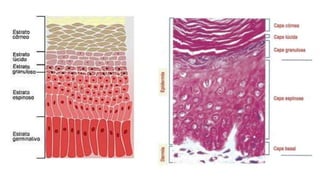 Este documento describe el sistema tegumentario, incluyendo la piel y sus derivados. Explica que la piel está compuesta de la epidermis, dermis e hipodermis. Entre los derivados de la piel se encuentran los folículos pilosos, glándulas sebáceas, glándulas sudoríparas y uñas. Además, detalla las funciones y estructuras de cada una de estas capas de la piel y sus derivados.