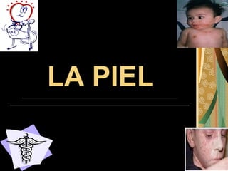 El documento proporciona información sobre la piel y sus anexos. Describe las capas de la piel, sus funciones como barrera y regulación térmica. Detalla las glándulas anexas y su contribución a la hidratación. Explica los pasos para la inspección y palpación de la piel, así como los datos y características a observar, incluyendo color, pelo, uñas, humedad, temperatura y textura. Finalmente, enumera diferentes tipos de lesiones primarias y secundarias de la piel.