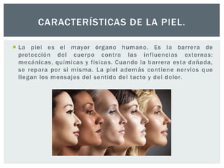 Este documento describe las características de la piel y su envejecimiento. Explica que la piel consta de tres capas principales: la epidermis, la dermis y la hipodermis. También describe los cambios que ocurren en la piel con el envejecimiento, incluido el adelgazamiento, las arrugas y la sequedad. Finalmente, resume algunas afecciones cutáneas comunes en personas mayores como escaras, úlceras, tumores y dermatitis.