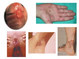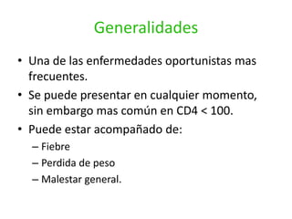 El documento resume las principales manifestaciones mucocutáneas que se presentan en pacientes con VIH. Describe las infecciones virales, bacterianas y fúngicas más comunes como el sarcoma de Kaposi, linfomas, herpes simple y zoster, candidiasis, sifilis. También cubre otras dermatosis como lipodistrofias, dermatitis seborreica, escabiosis y xerodermias. El documento provee detalles clínicos, diagnósticos y tratamientos para cada condición.
