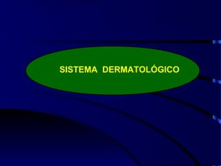 Este documento describe las manifestaciones clínicas y el examen de las enfermedades de la piel. Detalla los diferentes patrones, configuraciones y aspectos morfológicos de las lesiones primarias y secundarias, así como alteraciones del color, pelo, glándulas y tejido. Finalmente, enumera los tipos de problemas dermatológicos y pruebas de diagnóstico para evaluar enfermedades de la piel.
