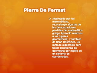 Este documento resume varios conceptos matemáticos empleados en la demostración del último teorema de Fermat, incluyendo curvas elípticas, funciones modulares, la función zeta y L-funciones, y representaciones de Galois. Finalmente, afirma que aunque el último teorema de Fermat en sí no es lo más importante, su demostración contribuyó significativamente al desarrollo de nuevas técnicas matemáticas y al conocimiento matemático en general.