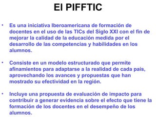 El documento describe el Programa Iberoamericano de Formación de Formadores en uso de Tecnologías de Información y Comunicación (PIFFTIC), una iniciativa para mejorar la calidad de la educación mediante la formación de docentes en el uso de las TIC. El PIFFTIC busca aprovechar las ventajas de las TIC para facilitar un modelo educativo centrado en el estudiante, fomentando competencias útiles. Sin embargo, también reconoce que es necesario complementar la dotación tecnológica con otros factores como la formación docente para garantizar