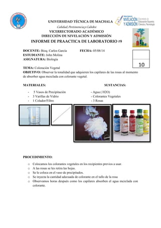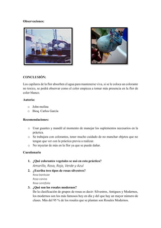 El estudiante John Molina realizó una práctica de laboratorio para observar cómo los capilares de las rosas absorben agua mezclada con colorantes vegetales no tóxicos. Colocó colorantes en vasos y les inyectó a tres rosas para ver cómo los capilares absorbían el agua teñida con el paso de las horas. Concluyó que los capilares absorben el agua y colorante para mantener vivas a las flores de color blanco.