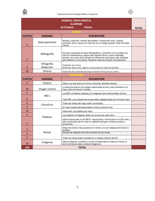 El documento presenta las actividades de una unidad temática de un curso de psicología médica y psiquiatría. Incluye instrucciones para realizar mapas mentales y conceptuales sobre temas como el desarrollo del adolescente y el suicidio. También contiene rúbricas para evaluar dichos mapas conceptuales, con criterios como la presentación, organización y conexión de conceptos.