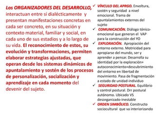 El documento habla sobre los organizadores del desarrollo en los seres humanos y cómo interactúan entre sí. Menciona que es importante reconocer la evolución de estos organizadores y elaborar estrategias ajustadas a cada etapa y contexto. También destaca la importancia de proporcionar entornos seguros y preparados para que los niños puedan explorar y descubrir libremente, sin intervención de los adultos, lo que les permite desarrollar su motricidad, identidad y comprensión del mundo.