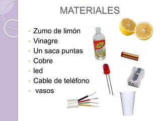 Este documento describe cómo hacer una pila casera usando materiales como zumo de limón, vinagre, un sacapuntas, cobre y un LED. Explica que se debe verter el zumo de limón en un vaso y el vinagre en otro, conectar un sacapuntas y un pedazo de cobre a cables, sumergirlos en los vasos y conectar el LED. Finalmente, indica que la pila funcionó cuando se mezclaron el zumo y el vinagre.