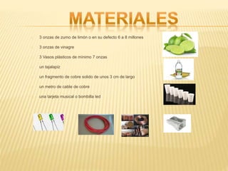 El documento describe un experimento para crear una pila casera utilizando zumo de limón, vinagre, cobre y un sacapuntas. Se midieron los voltios de cada sustancia por separado y juntas, pero ninguna fue suficiente para encender un LED.