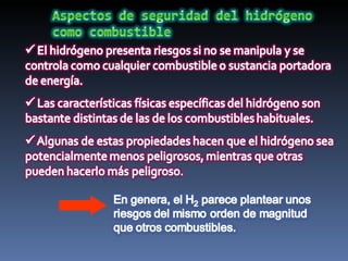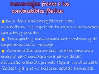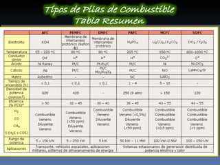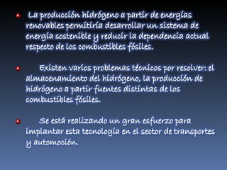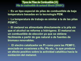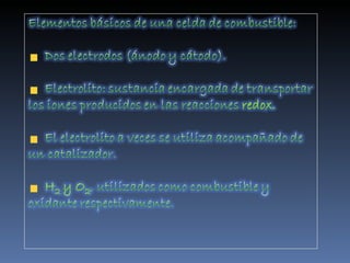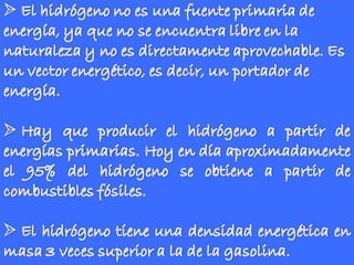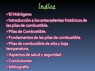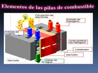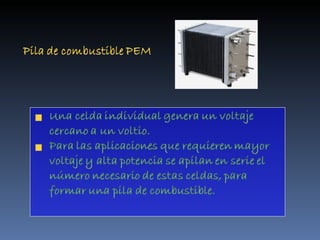 El documento proporciona información sobre diferentes tipos de combustibles y sus densidades de energía, así como métodos para producir hidrógeno. Explica los principios y aplicaciones de las pilas de combustible, clasificándolas según su temperatura de funcionamiento. Se describen las características, ventajas y desventajas de las pilas de membrana de intercambio de protones, fosfato ácido, alcalinas, óxido sólido y carbonato fundido.