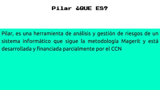 Pilar es una herramienta de análisis y gestión de riesgos de sistemas informáticos desarrollada por el CCN que sigue la metodología Magerit. Existen variantes de Pilar como la versión básica para Pymes y administración local o μPilar para análisis rápidos. Pilar analiza riesgos en confidencialidad, integridad, disponibilidad, autenticidad y trazabilidad y propone salvaguardas, normas y procedimientos de seguridad para tratarlos. También analiza el impacto