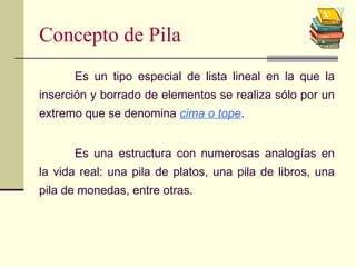 El documento describe el concepto de pila y sus aplicaciones. Explica que una pila es una estructura de datos lineal en la que solo se permiten inserciones y eliminaciones en un extremo. Luego detalla las operaciones básicas de una pila como apilar, desapilar, cima y cómo implementar una pila utilizando un arreglo. Finalmente, propone algunos ejercicios prácticos sobre el uso de pilas.