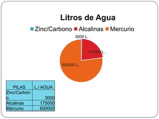 El documento habla sobre la contaminación causada por las pilas desechadas. Explica que las pilas contienen elementos químicos tóxicos que se oxidan y derraman en el suelo, agua y aire cuando son desechadas. Señala que una sola pila botón puede contaminar 6.5 millones de litros de agua y pide llevar las pilas usadas a centros de acopio para evitar la contaminación.