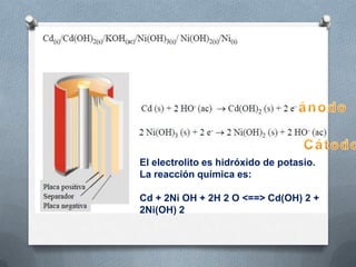 La pila de níquel-cadmio (NiCd) se desarrolló en los años 1970 como una variante de la pila de níquel e hidrógeno. Se compone de un electrodo positivo de hidróxido de cadmio y un electrodo negativo de hidróxido de níquel. Es recargable y liviana pero contiene cadmio que es tóxico. La pila de níquel-metal hidruro (NiMH) se desarrolló en 1989 como una alternativa sin cadmio a la NiCd.