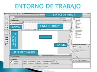 El documento describe los diferentes elementos de la interfaz de usuario de Adobe Flash, incluyendo las barras de menús, la línea de tiempo, las capas, el área de trabajo y las diferentes herramientas.