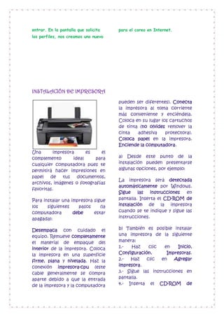 El documento proporciona instrucciones para instalar un fax y configurar Outlook 97/98 para enviar y recibir faxes. Explica cómo conectar el asistente a Internet, crear una cuenta de correo y una impresora, instalar el programa de fax y Outlook, y configurar Outlook para usar el correo y fax.