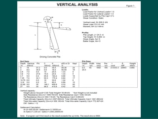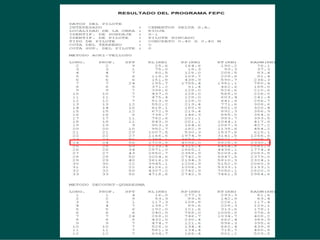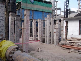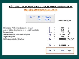 Este documento presenta información sobre el diseño de la cimentación por pilotes para el horno vertical de clinker No. 3 de la planta de cementos Selva en Rioja. Se realizaron sondajes de penetración estándar y extracción de muestras de suelo. Se evaluó la capacidad de carga de los pilotes usando métodos empíricos y analíticos, y se calculó el asentamiento. Finalmente, se determinó la carga de diseño para los pilotes con un factor de seguridad de 2.5.