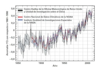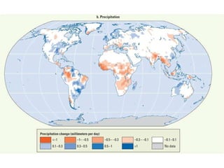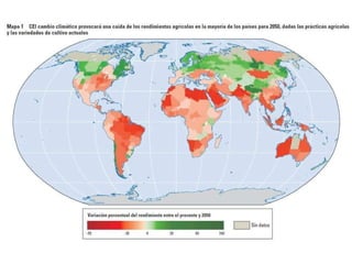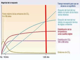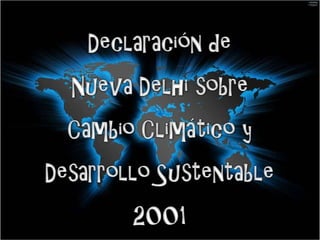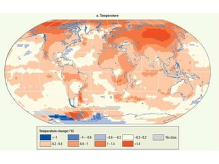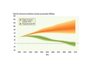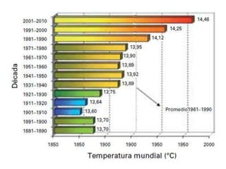 El documento discute la relación entre el cambio climático y el desarrollo sostenible. Explica que para abordar los desafíos del cambio climático, los países deben promover el desarrollo sostenible a través de la adaptación, mitigación y tecnología limpia. También analiza los posibles impactos sociales y económicos del cambio climático y las proyecciones del IPCC sobre el aumento de la temperatura y sus consecuencias para los sistemas naturales y humanos.