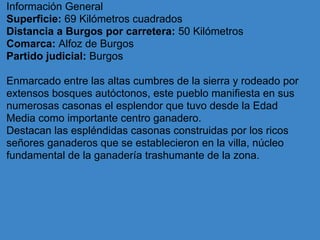 Pineda de la Sierra es un pueblo de 69 km2 ubicado a 50 km de Burgos, rodeado de bosques y montañas. El pueblo muestra las grandes casonas de los ricos ganaderos que se establecieron allí durante la Edad Media y desarrollaron la ganadería trashumante. Estas casonas son edificios sólidos de piedra arenisca con chimeneas características. La iglesia de San Esteban data del periodo románico aunque fue transformada posteriormente. Pineda de la Sierra ofrece excursiones a