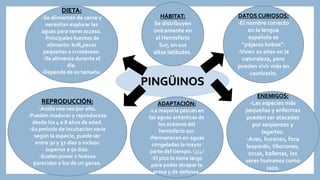 Este documento proporciona información sobre los pingüinos. Se distribuyen únicamente en el Hemisferio Sur, anidan una vez por año y su periodo de incubación varía según la especie entre 30 y 50 días. Se alimentan principalmente de krill, peces pequeños y crustáceos en las aguas antárticas, y su pico largo les ayuda a atrapar presas y defenderse.