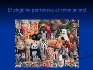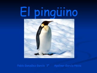 El documento describe las características del pingüino, incluyendo que es un ave vertebrada ovípara que se alimenta de peces, calamares y krill y usa pliegues de piel para mantener calientes a sus crías.