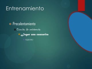 El documento describe un entrenamiento de fútbol que incluye un precalentamiento, un circuito de resistencia, una cascarita y un periodo de reposo. Las instalaciones donde se llevará a cabo el entrenamiento son la cancha de la UDC y la cancha de la unidad Morelos.