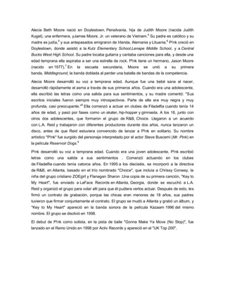 P!nk es una cantante y compositora estadounidense que saltó a la fama a principios de los 2000 con éxitos como "There You Go" y "Get the Party Started". Ha lanzado seis álbumes de estudio que han alcanzado el número uno en varios países. Es conocida por su potente voz y por fusionar diferentes géneros como el pop, rock y R&B. A lo largo de su carrera ha vendido más de 50 millones de discos y ha ganado varios premios Grammy y MTV.
