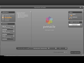 Pinnacle Studio es un software de edición de video profesional que permite importar, editar y exportar videos. Permite importar videos de cámaras, recortar clips, agregar efectos, transiciones y música. Ofrece herramientas para editar el orden y contenido de los videos. Finalmente, permite exportar los videos editados a formatos como DVD, archivo de video, o dispositivos de almacenamiento para compartir el video finalizado.