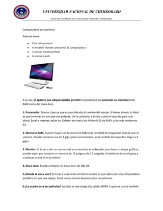El documento analiza las características básicas que debe poseer una computadora de escritorio y portátil para las actividades normales de un estudiante. Menciona que una computadora de escritorio debe tener un procesador potente, al menos 4 GB de RAM, un monitor de 17 pulgadas, un disco duro de 500 GB y Windows 7 u 8. Una portátil requiere de 1-2 GB de RAM, una pantalla de 15 pulgadas, y puede incluir una grabadora de DVD para presentaciones. Ambas deben ser capaces de ejecutar software educativo