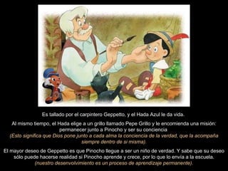 El cuento de Pinocho cuenta la historia espiritual del alma humana y su evolución a través de las tentaciones y lecciones de la vida. Pinocho es creado por Geppetto y dado vida por el Hada Azul para convertirse en un niño de verdad a través del aprendizaje. A pesar de las advertencias de Pepe Grillo, Pinocho comete errores que lo llevan a la Isla del Placer donde los niños se convierten en burros, pero logra escapar. En el fondo del mar dentro de una ballena, Pinoch