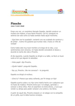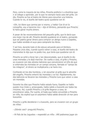 Un carpintero llamado Gepetto construyó un muñeco de madera llamado Pinocho, al que un hada dio vida. Pinocho empezó a ir a la escuela pero prefería divertirse, lo que le causó varios problemas como quedar atrapado en un teatro de títeres y ser engañado por ladrones. Mientras tanto, Gepetto salió a buscar a Pinocho y fue tragado por una ballena. Pinocho también entró en la ballena para rescatar a Gepetto. Finalmente lograron salir a salvo